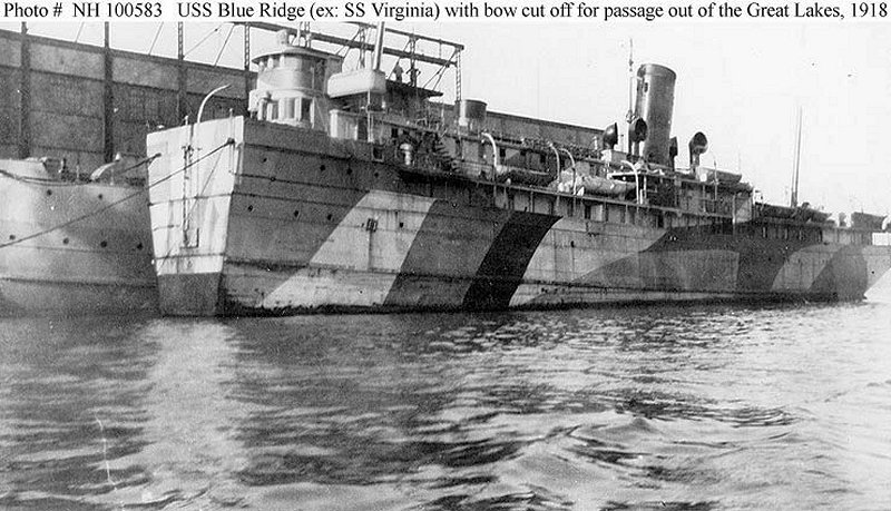 Wearing camouflage paint and with her bow removed for passage through the locks between the Great Lakes and the St. Lawrence River, circa summer 1918. U.S. Navy photo NH 100583 |