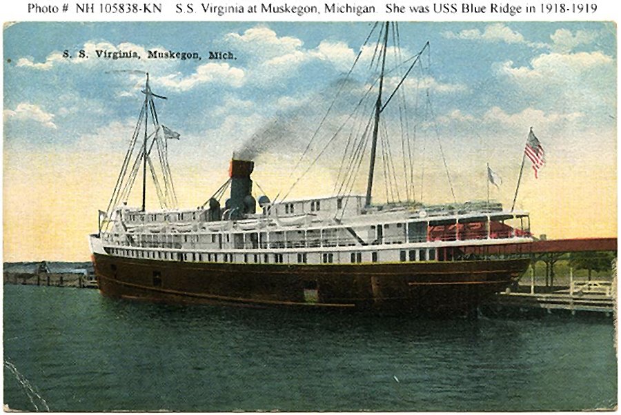 Underway on the Great Lakes, early in her career. This heavily retouched photograph was printed on a postal card. Virginia's upperworks were modified prior to World War I. U.S. Navy photo NH 100582 |