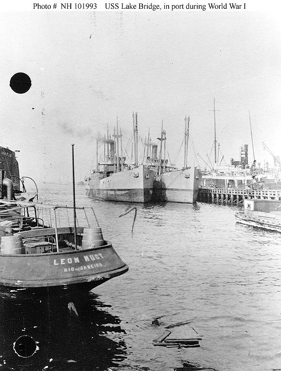 Lake Bridge (ID 2990) - center, marked by arrow. Photographed during World War I. The stern of the tug Leon Nuct (or Leon Muct), of Rio de Janeiro, Brazil, is in the left foreground U.S. Navy photo NH 101993 |