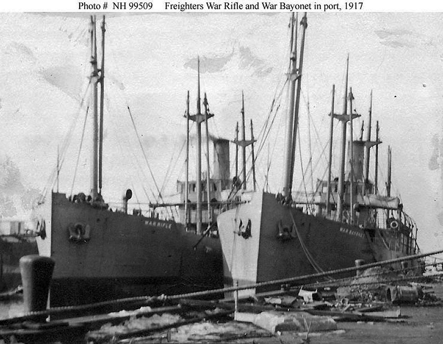 War Rifle and S.S. War Bayonet in port, possibly in the New York City area when they were inspected by the Third Naval District on 26 December 1917 Naval Historical Center photo NH 99509 |