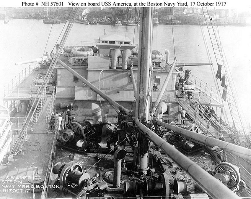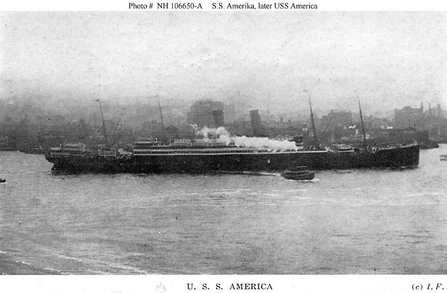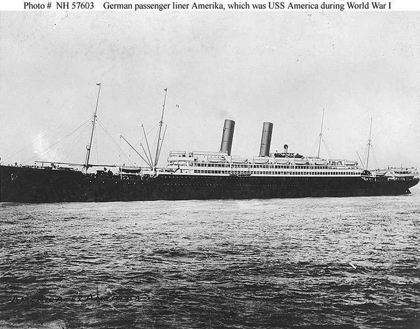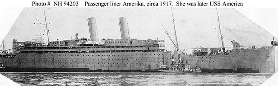 The ex-German passenger vessel Amerika, at the Boston Navy Yard, 14 August 1917 shortly after seizure by USSB undergoing conversion for Naval service. U.S. Navy photo from DANFS |