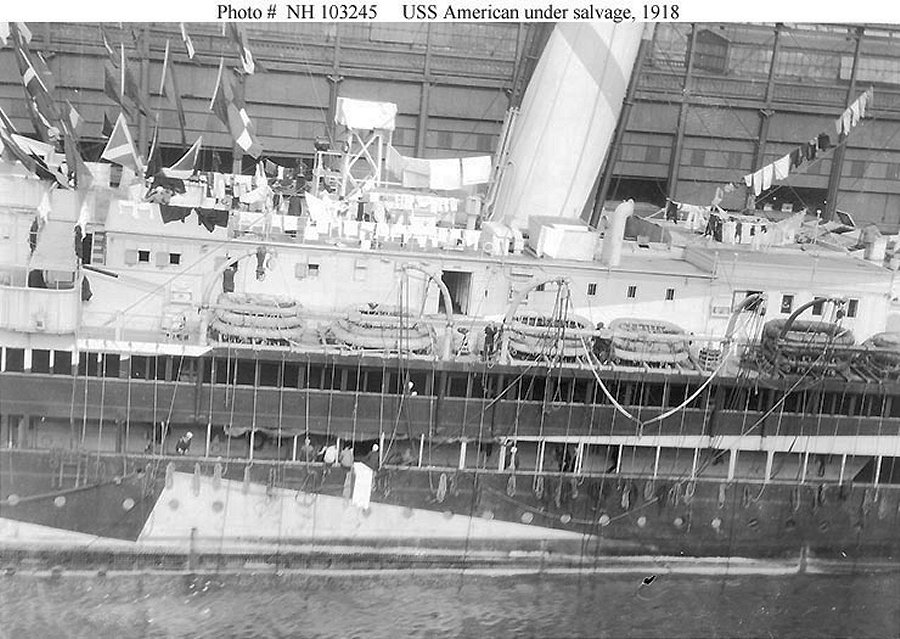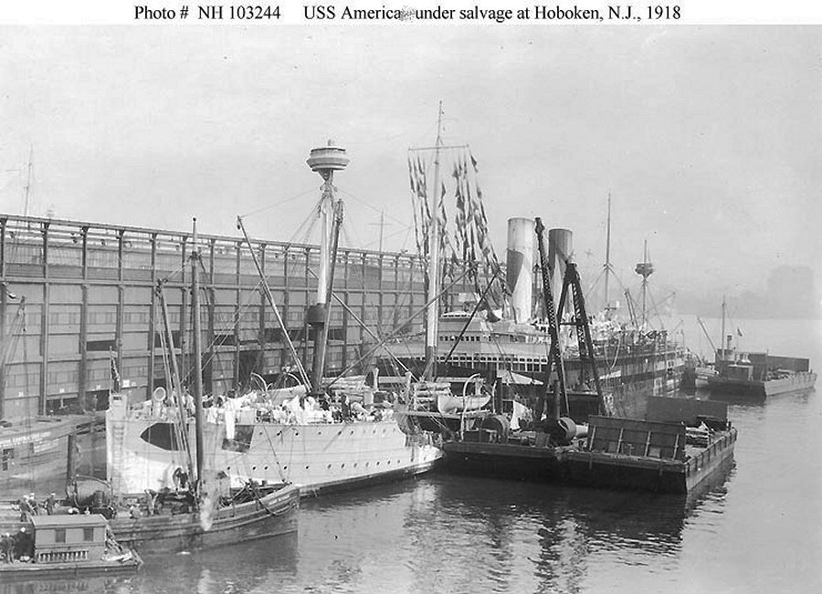 America after she had been pumped out and refloated after sinking at her pier after seawater had poured through open coaling ports. Naval History and Heritage Command photo from "Great Liners at War" by Stephen Harding |