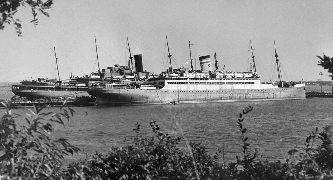USAT Edmund B. Alexander on the right side of the pier and USAT George Washington on the left side of the pier, laid up in reserve at Hawkins Point, in the harbor at Baltimore, MD, 2 August 1949 Wirephoto thanks to Dave Schroeder |