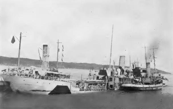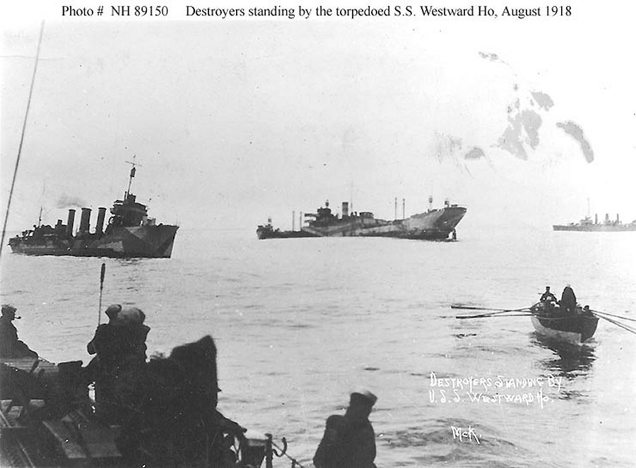 88k | U.S. Navy destroyers standing by the damaged ship, after she was torpedoed by the German submarine U-62 in the eastern Atlantic on 8 August 1918 Collection of Lieutenant Commander P. W. Yeatman, USN (Retired) U.S. Navy photo NH 89150 |