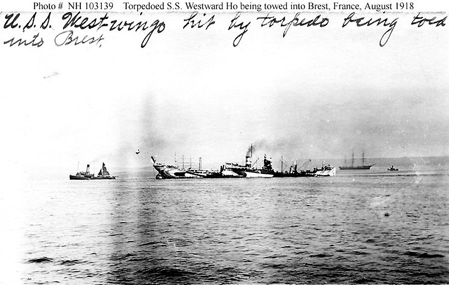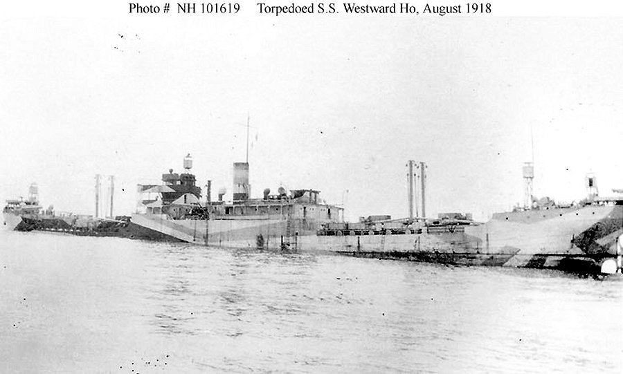 74k | Photographed in the eastern Atlantic, soon after she was torpedoed by the German submarine U-62, on 8 August 1918 Courtesy of Jack Howland, 1987 U.S. Navy photo NH 101619 |