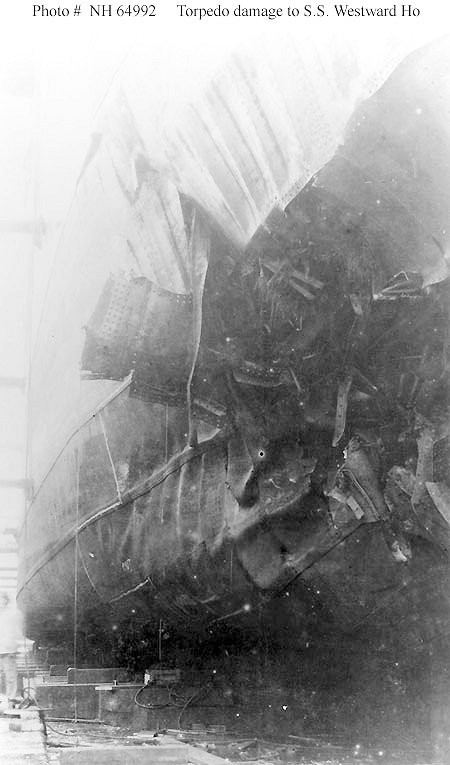 57k | View of the ship's starboard side, forward, showing torpedo damage inflicted by the German submarine U-62 in the eastern Atlantic on 8 August 1918 Collection of Peter K. Connelly. Courtesy of William H. Davis, 1967 U.S. Navy photo NH 64992 |