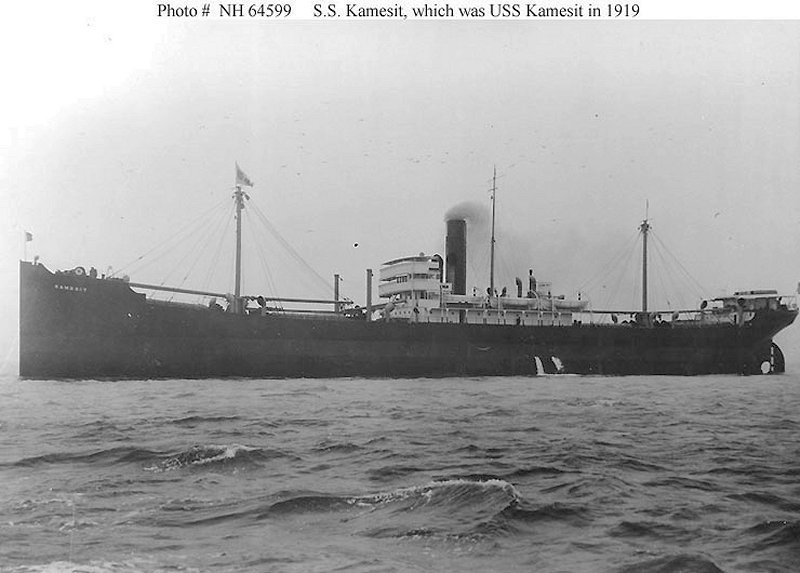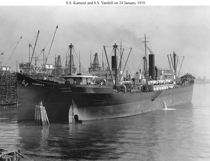113k> | SS Kamesit photographed on 24 January 1919 alongside a sister, Yamhill (later USS Arctic (AF-7)), at the yard of her builder, Moore Shipbuilding Co., Oakland, California. National Archives photo from Shipscribe.com |