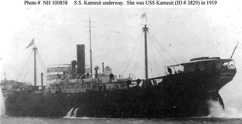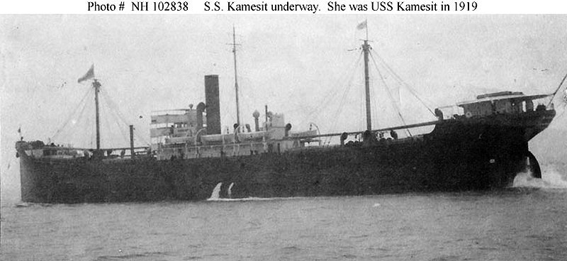 Departing Mare Island 1 February, Kamesit loaded with barley at Porta Costa, Calif., and sailed 13 February for New York via the Panama Canal. She transited the canal 28 February and diverted to Newport News, arriving 8 March. After receiving repairs and fuel, Kamesit sailed the 18th for Hull, England, where she arrived 6 April to discharge her cargo. Loaded with ballast, she departed for New York the 18th and returned to Hull the same day for repair of a disabled steering gear. Underway 26 April, she received orders 8 May to proceed to Philadelphia and arrived 18 May. Kamesit decommissioned 23 May and was delivered to USSB the same day. She remained in custody of USSB until abandoned in 1930.