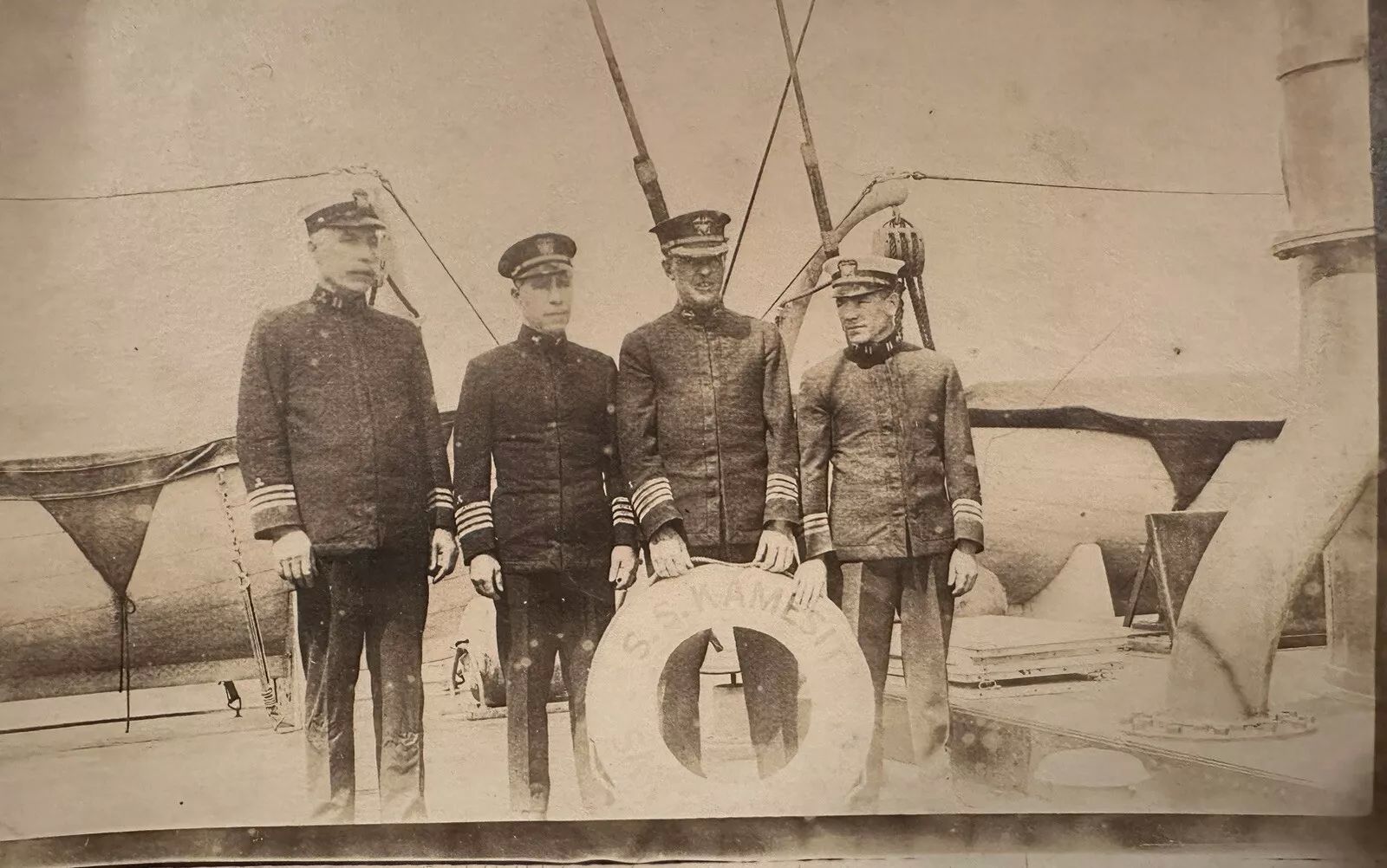 209k> | RPPC of officers of Kamesit (ID-3829), 1919. Writing on back states: "in order of size: 1st asst. engineer, Capt., Chief Engineer, mate." | Dave Wright | |
