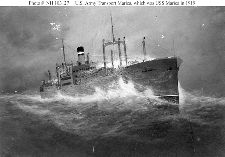 102k | Contemporary photograph of an artwork, depicting the ship in heavy seas. Courtesy of Edwin T. Galvin, 2005. The original print came from the collection of the donor's father, William T. Galvin, a U.S. Coast Guardsman who had served in Marica's crew. U.S. Navy photo NH 103127. |