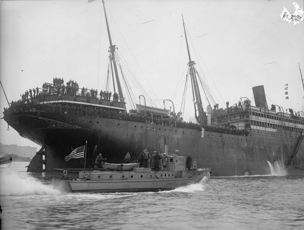 117k | c. February 1919 Major General Clarence R. Edwards on board Diaquiri greets members of the 26th Division embarked in Mount Vernon (ID 4508) entering Boston harbor Courtesy of Boston Public Library, Leslie Jones collection |
