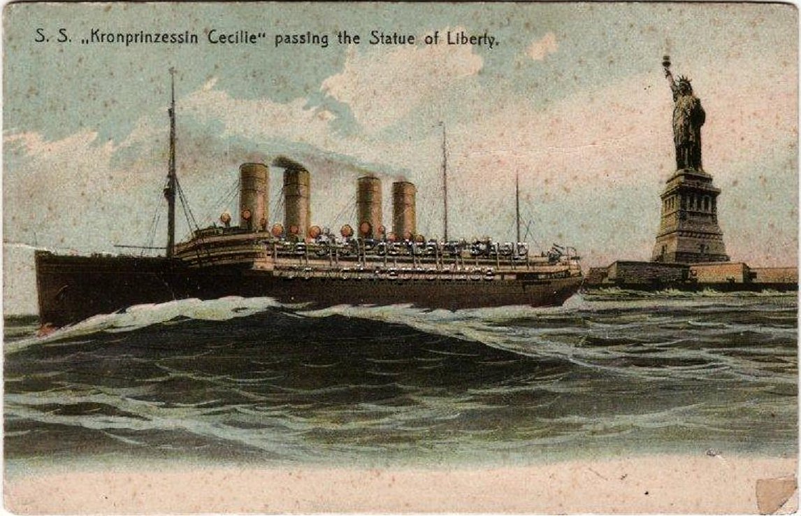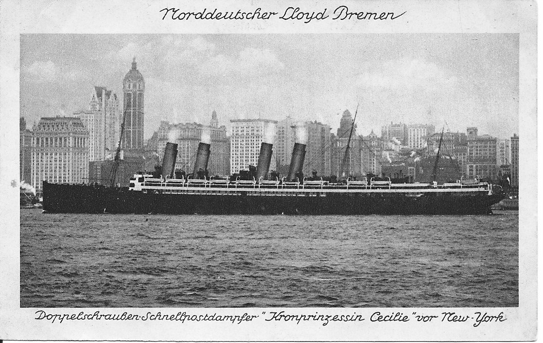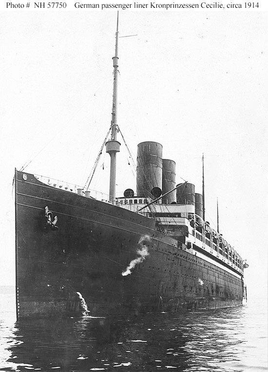81k | SS Kronprinzessin Cecilie possibly photographed when she arrived in United States waters in early August 1914, just after the beginning of World War I U.S. Navy photo NH 57750 |