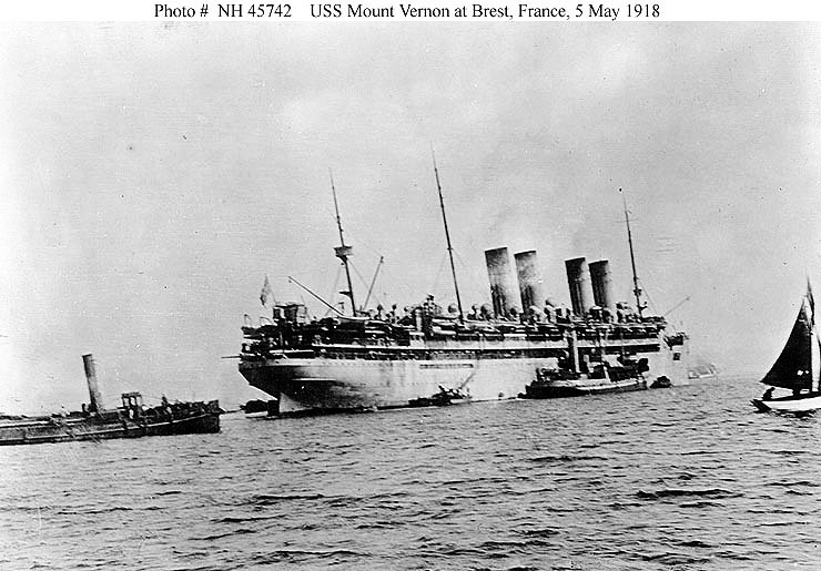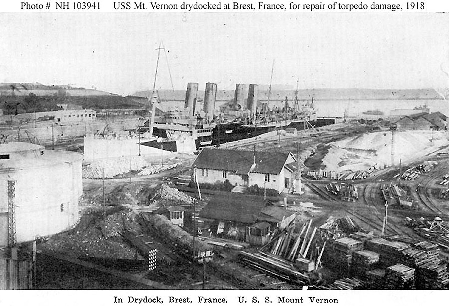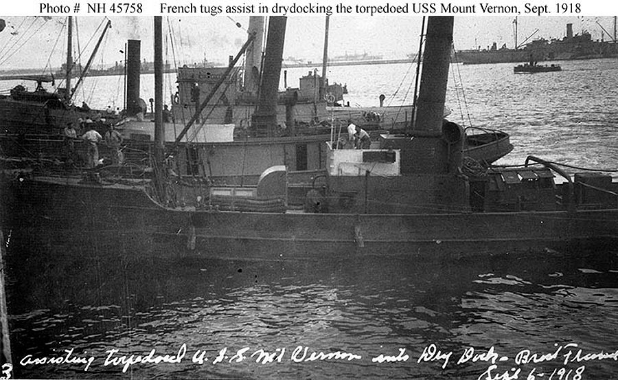 151k | French tugs assisting the Mount Vernon into drydock at Brest, France, on 6 September 1918. USS Prometheus is in the right distance, with U.S. Navy destroyers alongside Naval Historical Center photo NH 45758 |