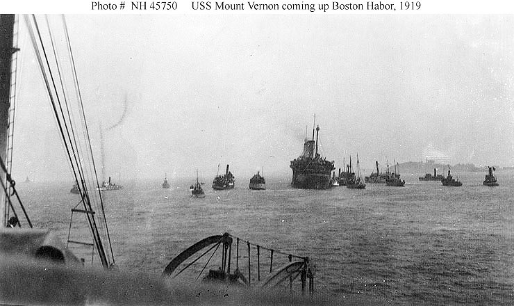 78k | Coming up Boston Harbor with elements of the 26th Division on board, in 1919. She is convoyed by craft of the First Naval District Photographed by Alton Blackinton, Boston. U.S. Navy photos NH 45750 and NH 45751 |