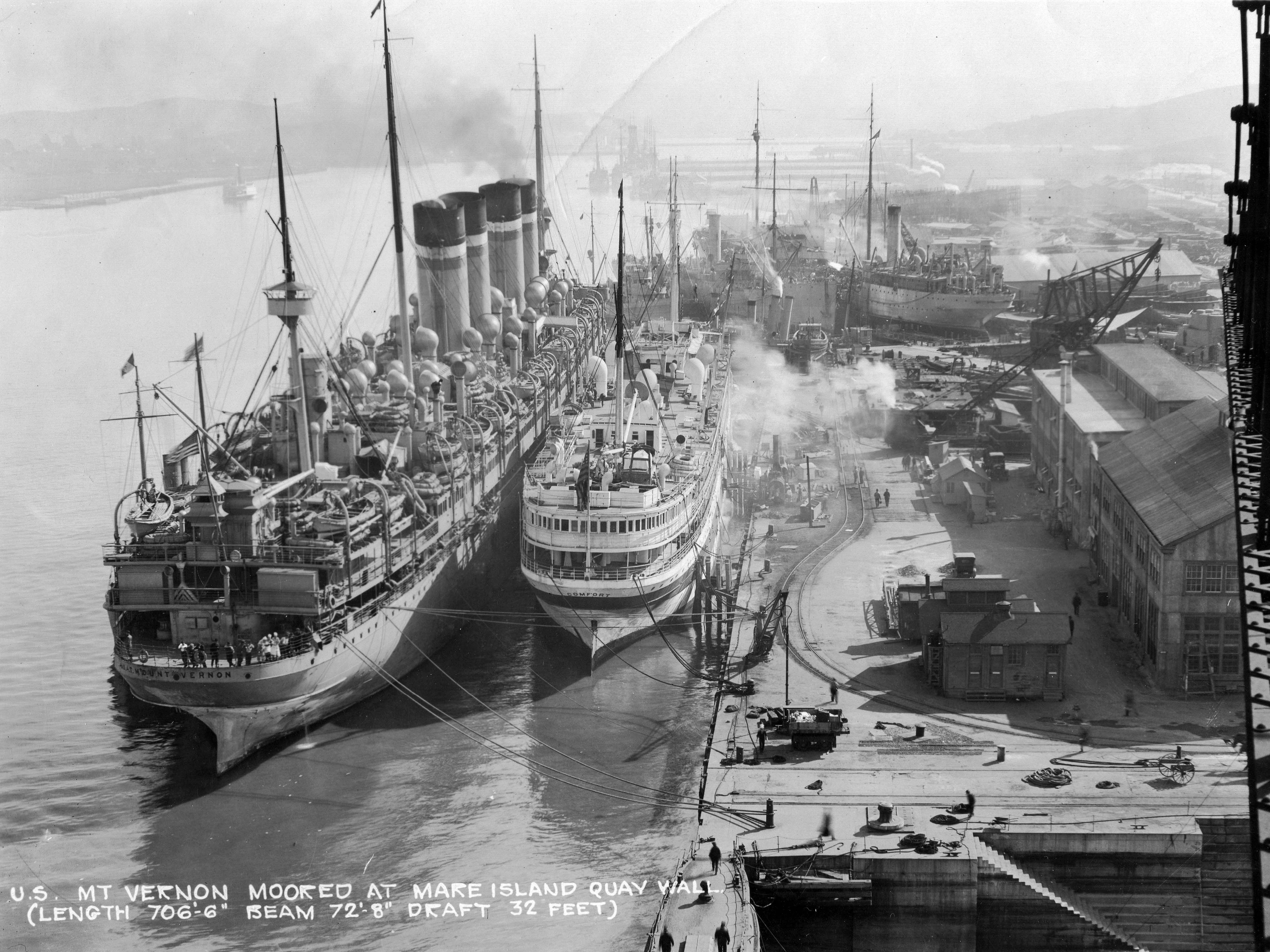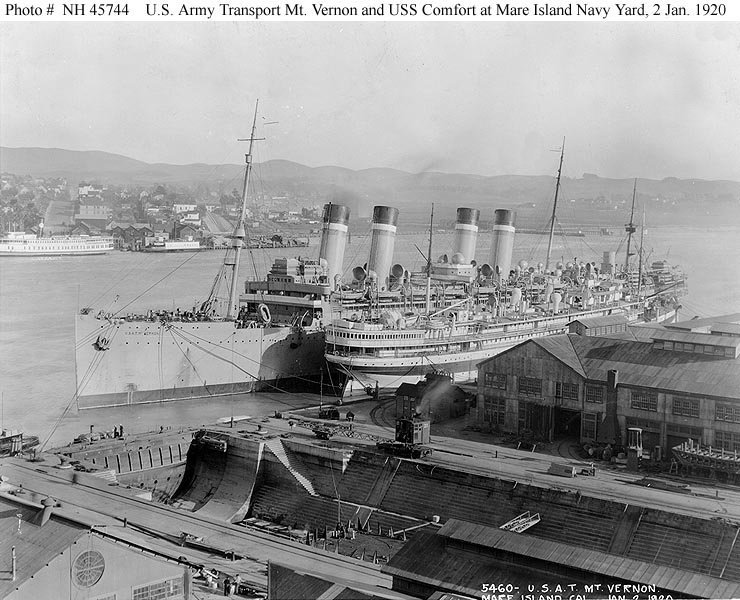 1,854k | Mount Vernon moored outboard of the Navy hospital ship Comfort, at the Mare Island Navy Yard, California, in January 1920 Photograph from the William H. Topley Collection; courtesy of Charles M. Loring, 1970 U.S. Navy photo NH 71246 7 - 24 February 1920 Mare Island Navy Yard |