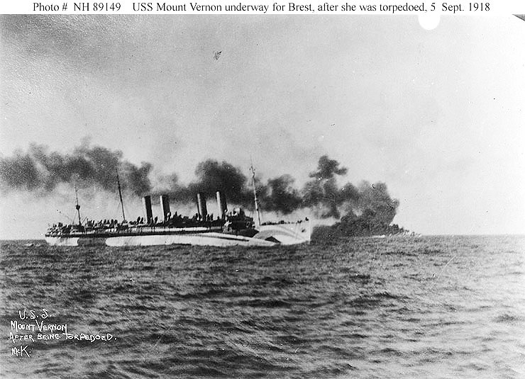 124k | Steaming towards Brest, France, after she had been torpedoed by German submarine U-82 in the eastern Atlantic on 5 September 1918. An escorting destroyer is laying a smoke screen in the background Collection of Lieutenant Commander P.W. Yeatman, USN (Retired) U.S. Navy photo NH 89149 |