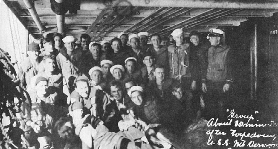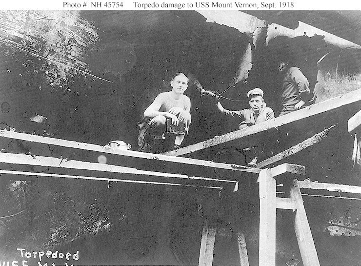 108k | 5 September 1918 With the flooding contained and Mount Vernon apparently out of immediate danger, these understandably elated sailors - some still wearing life jackets - pose for a group photo. The scenes below were far less happy, for the detonation of U-82's torpedo on the troopship's starboard side killed thirty-six crewmen outright and wounded another fifteen Naval History and Heritage Command photo from "Great Liners at War" by Stephen Harding |