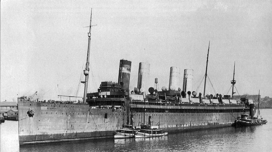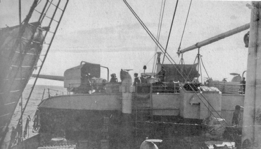 81k | 5 September 1918 Her number two (port side) 5" gun comes into action as the ship turns away from the suspected position of U-82. Gunfire and depth charges helped to keep the submarine under while the damaged trooper made her escape, accompanied by Agamemnon and three of the five escorting destroyers Naval History and Heritage Command photo from "Great Liners at War" by Stephen Harding |