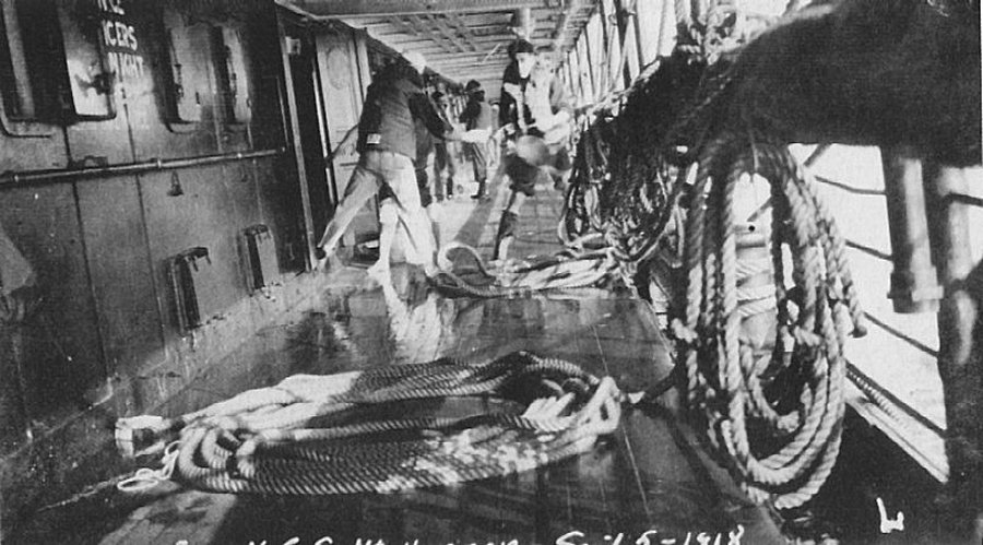 111k | 5 September 1918 Even as Captain Dismukes set Mount Vernon on a course for Brest, his damage-control parties were working hard to contain the flooding caused by the torpedo hit. In this photo, sailors at the end of a bucket-brigade line are throwing over the side water that's been brought up from below Naval History and Heritage Command photo from "Great Liners at War" by Stephen Harding |