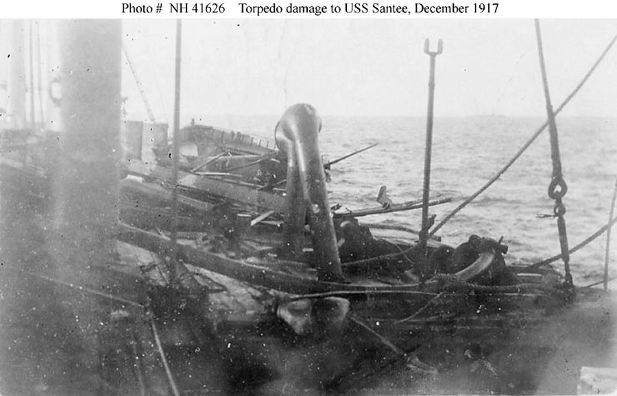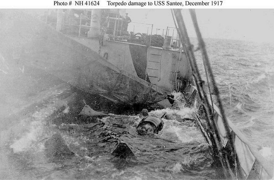 Ship's after well deck awash, while being towed into Queenstown, Ireland after receiving torpedo damage on 27 December 1917 Courtesy Captain David C. Hanrahan, USN, November 1929 Naval Historical Center photo NH 41624 |