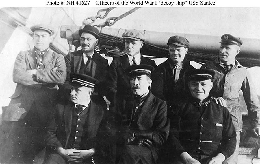 Ship's officers, wearing civilian clothing as part of Santee's disguise as an anti-submarine "decoy ship", circa late 1917 or early 1918 Seated in front are (left to right): Lieutenant John R. Peterson, Jr., Executive Officer and Navigator; Commander David C. Hanrahan, Commanding Officer; and Lieutenant Robert E.P. Elmer, Gunnery Watch. Standing are (left to right): Acting Pay Clerk John P. Killeen; Lieutenant (Junior Grade) Arthur D. Warwick, First Lieutenant of Watch; Assistant Surgeon Thomas L. Sutton, Medical Officer; Lieutenant (Junior Grade) James P. Compton, Torpedo Watch; and Machinist Charles C. Roberts, Engineer Officer Courtesy Captain David C. Hanrahan, USN, November 1929 Naval History and Heritage Command photo NH 41627 |