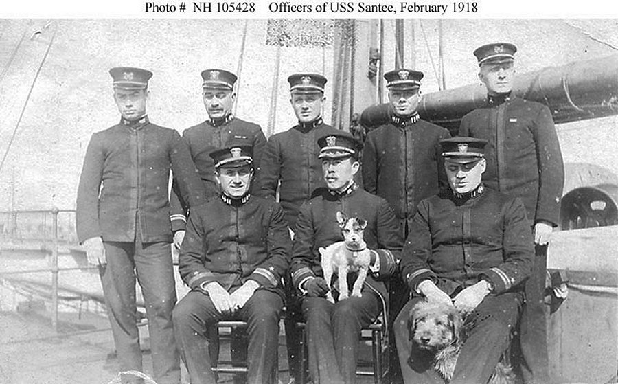 Ship's officers in U.S. Navy uniforms, with mascot dogs. Photographed on board Santee at Devonport dry dock, England, 20 February 1918 Seated in front are (left to right): Lieutenant John R. Peterson, Jr.; Commander David C. Hanrahan, Commanding Officer; and Lieutenant Robert E.P. Elmer. Standing are (left to right): Acting Pay Clerk John P. Killeen; Lieutenant (Junior Grade) Arthur D. Warwick; Assistant Surgeon Thomas L. Sutton, Medical Officer; Lieutenant James P. Compton; and Machinist Charles C. Roberts, Engineer Officer Donation of Dr. Mark Kulikowski, 2007 Naval History and Heritage Command photo NH 105428 |