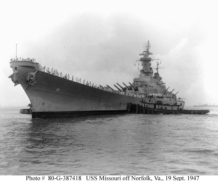 as the battleship arrives at the Naval Operating Base, Norfolk, VA., from Rio de Janeiro, Brazil, with President Harry S. Truman and his party on board, 19 September 1947. Missouri is manning the rails in his honor. US National Archives photo # 80-G-387418, a US Navy photo now in the collections of the US National Archives. |