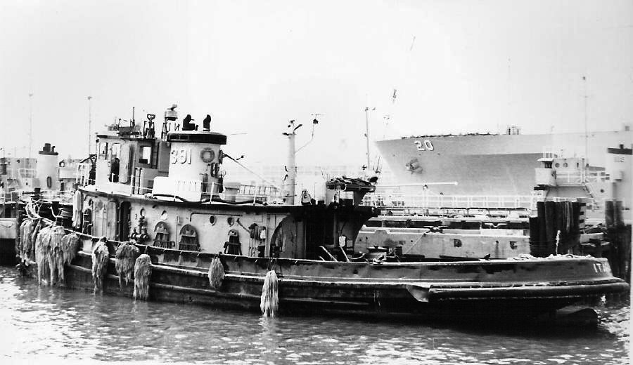 88k | Itara (YTM-391) moored at the tug piers at NOB Norfolk, VA., circa 1980s. Note USS Mount Whitney (LCC-20) in the background. Photo courtesy Franz Von Riedel contributed to US Navy Harbor Tug Boats web site. |