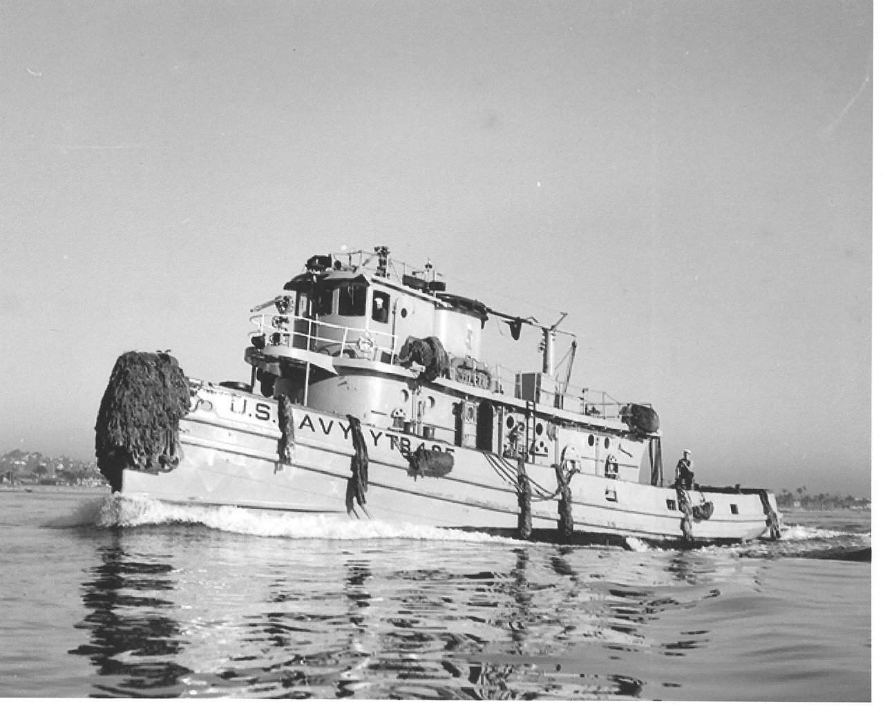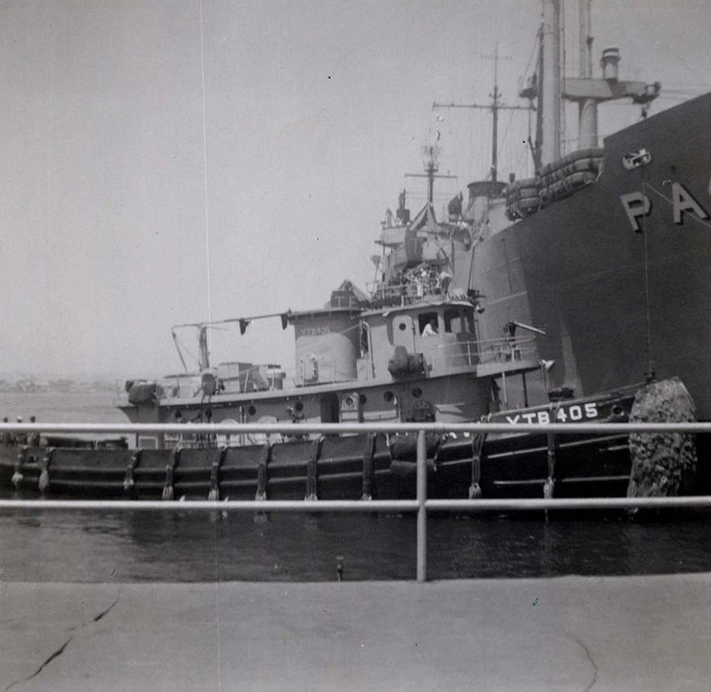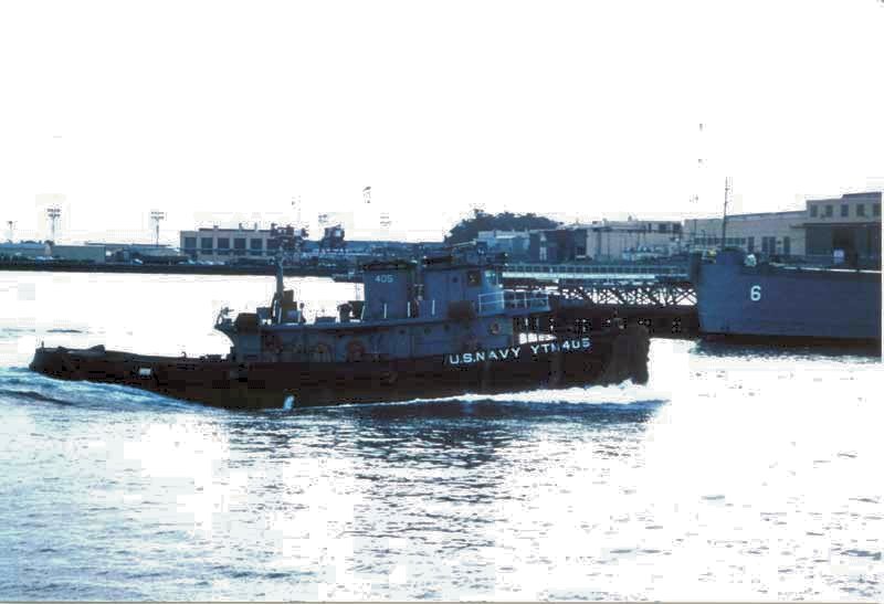 56k | Cusseta (YTM-405) underway near Naval Air Station San Diego, Pier Juliet. Note the stern of the First Fleet Flagship USS Providence (CLG-6). Providence usually moored at this pier. Courtesy Paul Smith US Navy Tug Boats. Caption courtesy Cris Hastin |