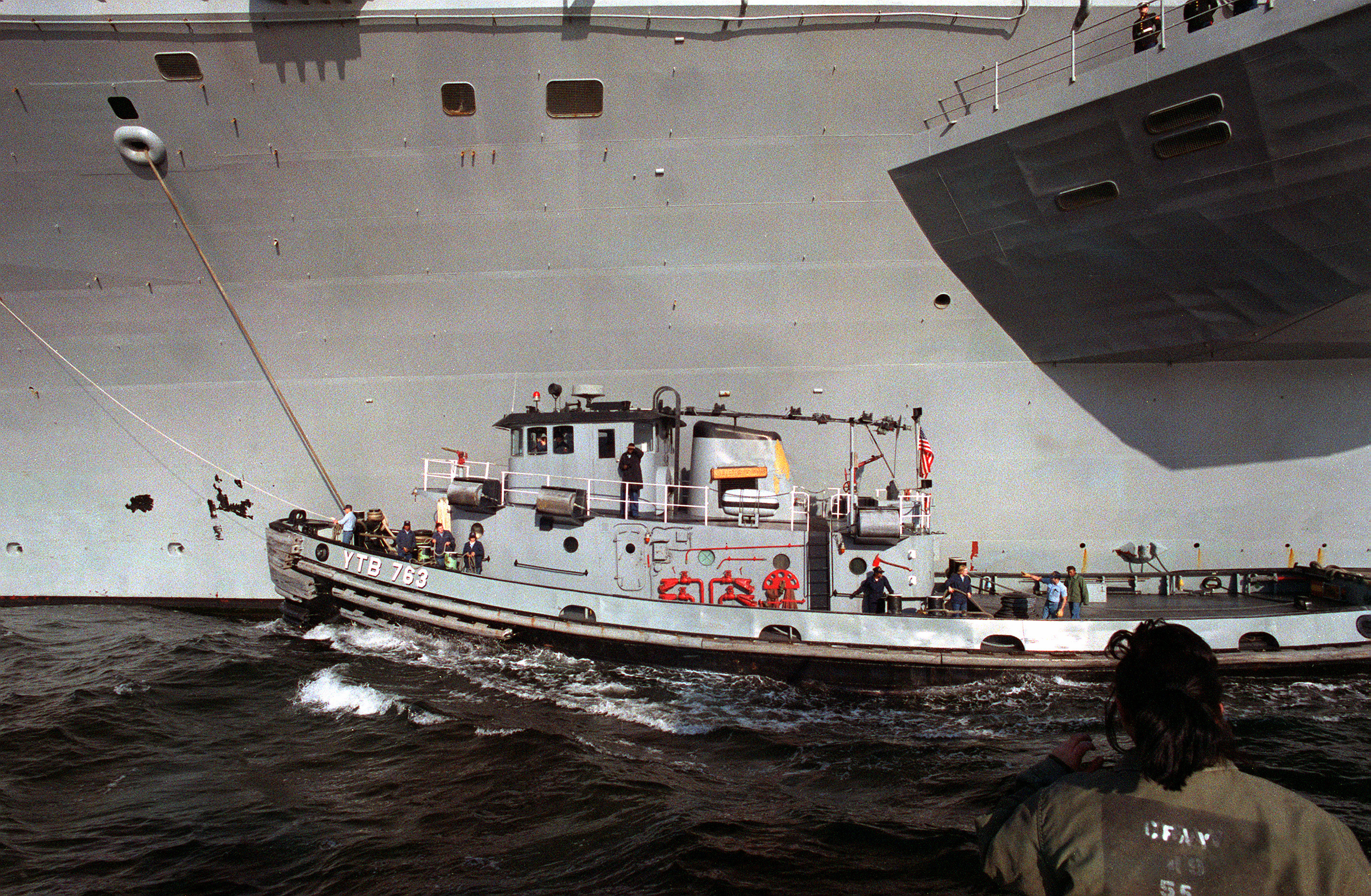 5131k | Muskegon (YTB-763) moving in alongside the nuclear-powered aircraft carrier USS Carl Vinson (CVN-70) in preparation for docking the ship at Commander Fleet Activities Yokosuka, Japan (CFAY), 11 March 1994. Carl Vinson was making a port visit before deploying to the Persian Gulf. Department of Defense photo # DN-SC-95-00517 by PHAN Trahan, USN |