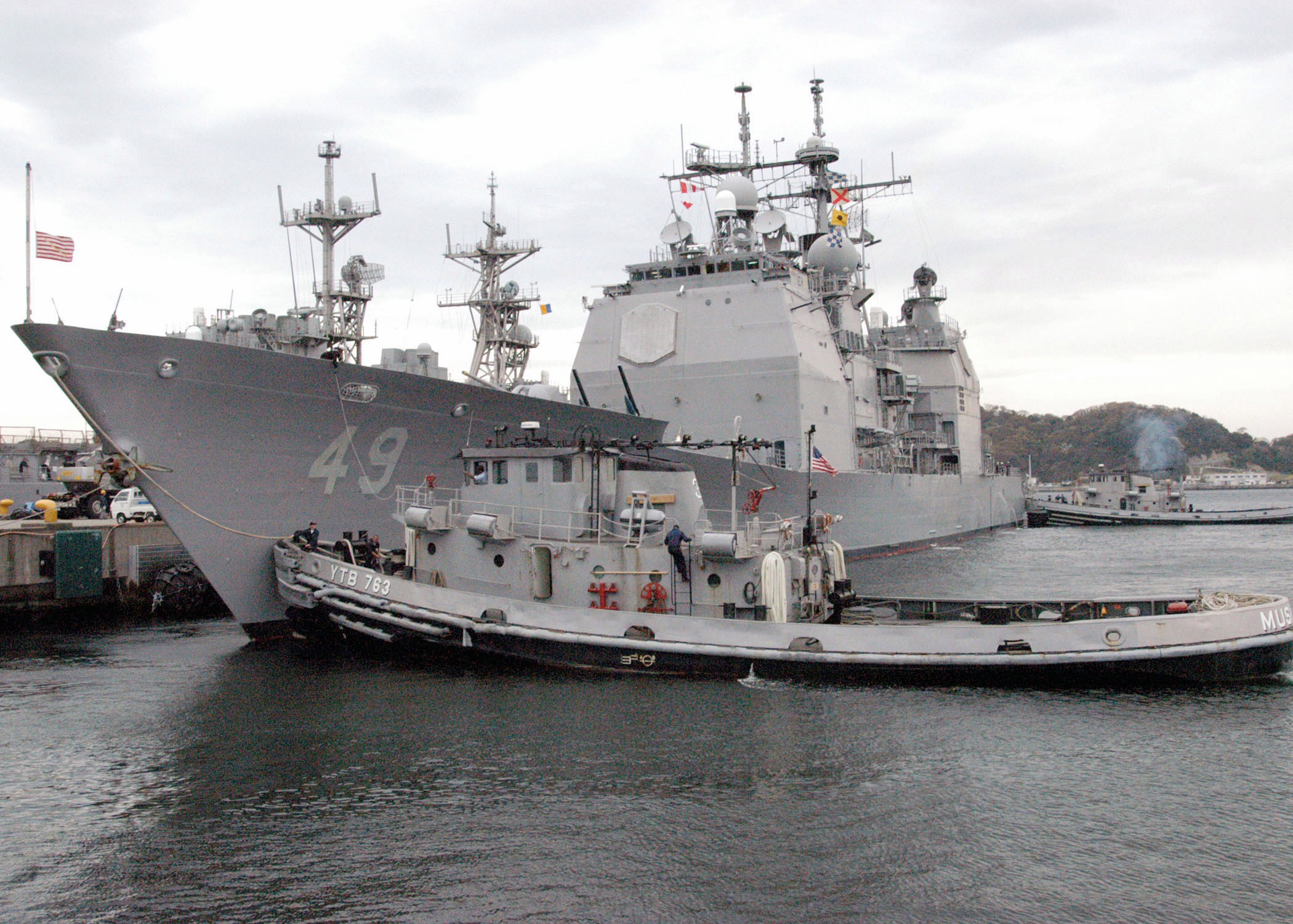147k | Muskegon (YTB-763) assists the USS Coronado (AGF-11) as she arrives at Fleet Activities base, Yokosuka, Japan, 24 March 2004. US Navy photo contributed the National Association of Fleet Tug Sailors by Ray Longaker. |