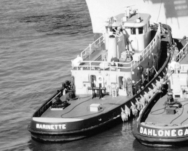 76k | Marinette (YTB-791) and Dahlonega (YTB-770) working alongside an unidentified ship, in Hampton Roads, date and location unknown. Photo from the collections of the US Navy Memorial. |