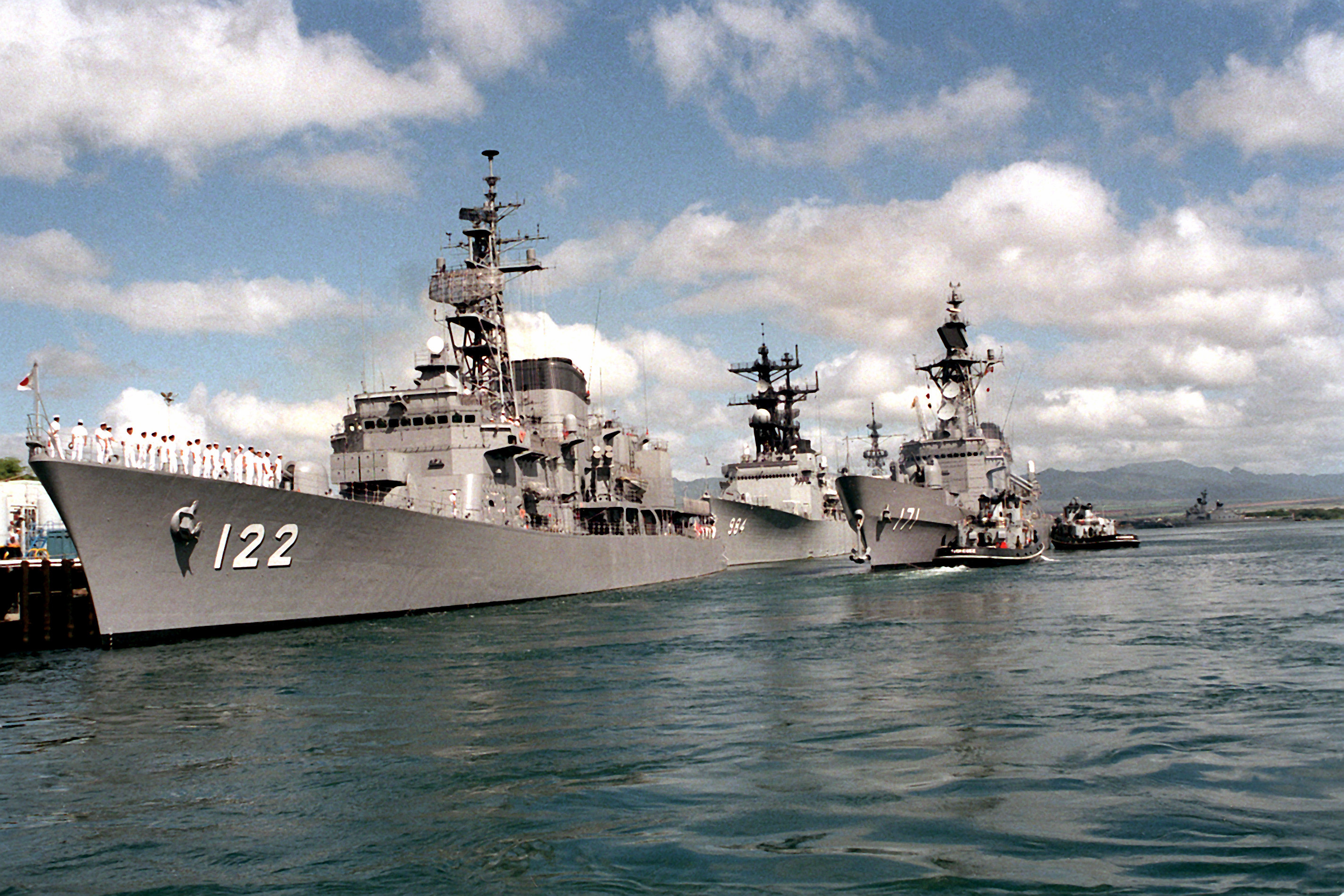 1675k | The Japanese Maritime Self Defense Force destroyer JDS Hatsuyuki (DD-122), foreground, and the destroyer USS Leftwich (DD-984) are moored at a pier as the Tuskegee (YTB-806) and another tug maneuver the Japanese Maritime Self Defense Force destroyer JDS Hatakaze (DD-171) into her assigned berth at Naval Station Pearl Harbor, HI., 1 April 1989.