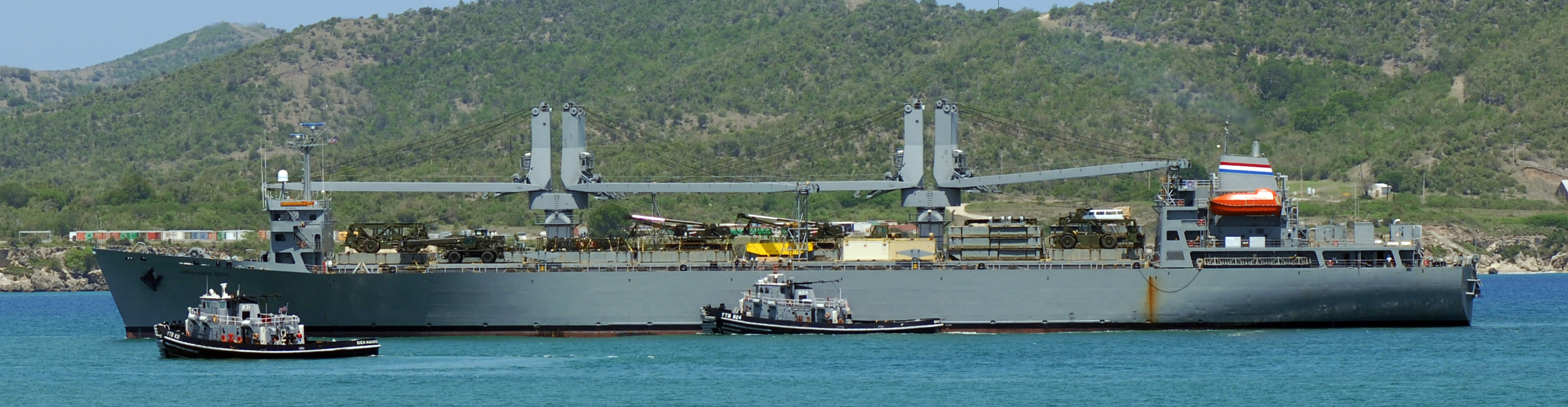 1830k | Dekanawida (YTB-831) and Santaquin (YTB-824) assist SS Cornhusker State (ACS-6) as she arrives at US Naval Station Guantanamo Bay for the exercise Joint Logistics Over The Shore (JLOTS) 09. JLOTS is a critical capability that allows the military to move forces and supplies without the benefit of a fixed, deep-draft port. The exercise will demonstrate the Navy, Army, and Marine Corps ability to deploy, discharge and conduct reception and staging of equipment in a scenario that requires ships to offload while still offshore. US Navy photos # 090605-N-0557G-002 GUANTANAMO BAY, Cuba (June 5, 2009), by MC1 Brian A. Goyak. |