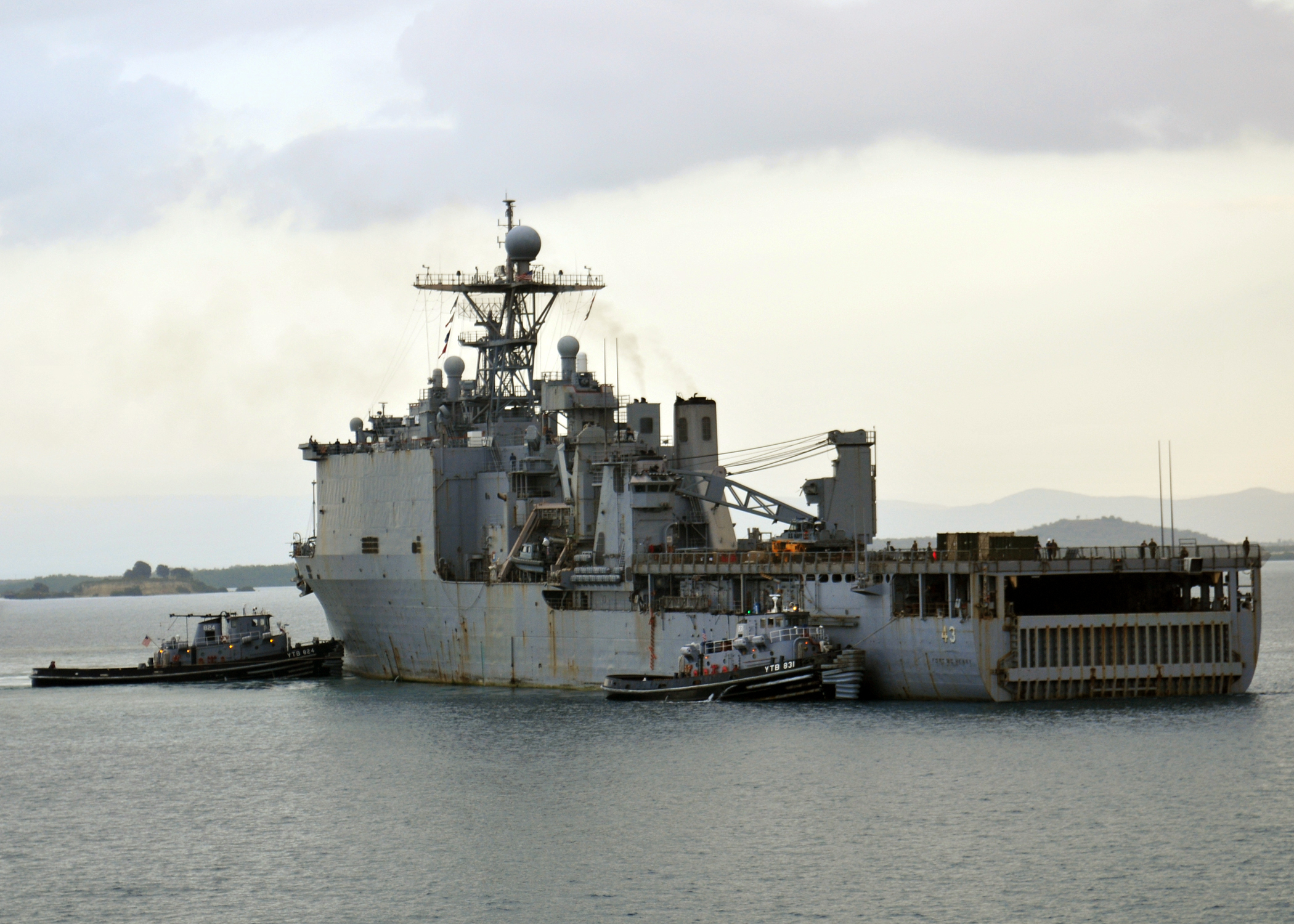 1868k | Dekanawida (YTB-831) and Santaquin (YTB-824) guide USS Fort McHenry (LSD-43) into port at Naval Station Guantanamo Bay, to take on supplies and fuel. Fort McHenry has been operating off the coast of Haiti providing humanitarian assistance as part of Operation Unified Response. Naval Station Guantanamo Bay is the primary logistical hub for routing humanitarian relief to Haiti. US Navy photo # 100213-N-1441M-690 GUANTANAMO BAY, Cuba (Feb. 13, 2010) by MC2 Marie A. Montez |