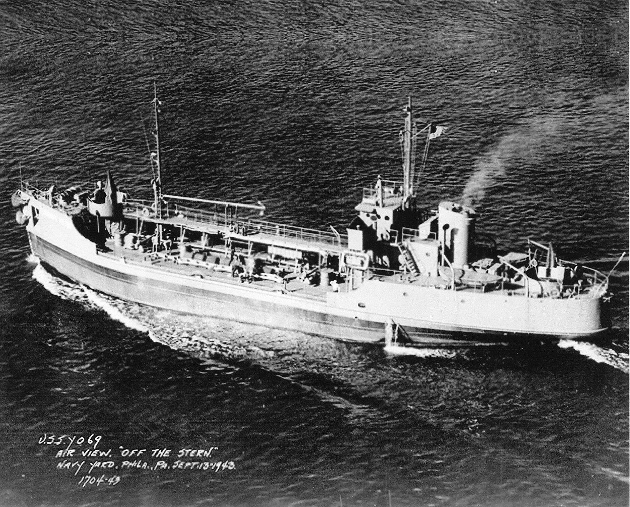 492k | Aerial view "off the Stern" of YO-69 underway in the Schuylkill River off Philadelphia Navy Yard, 13 September 1943. Philadelphia Navy Yard photo 1704-43 |