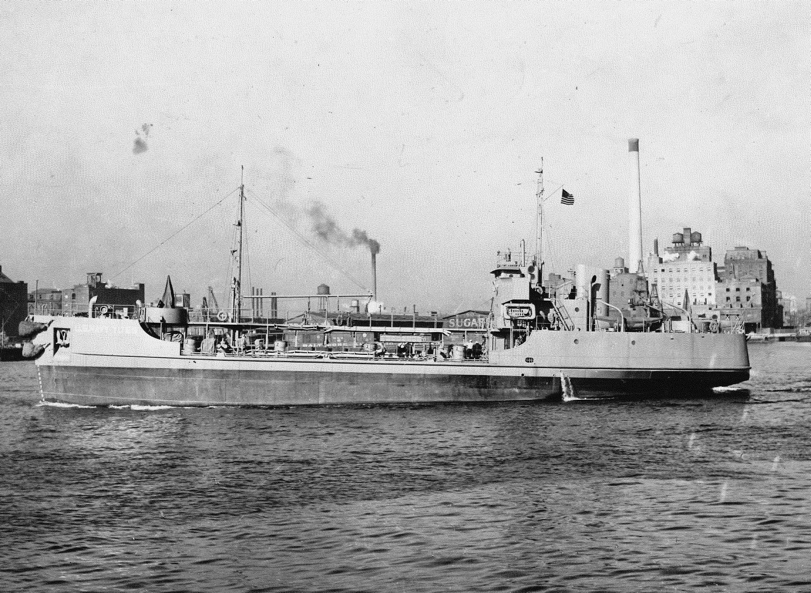 595k | YO-69 underway on the Delaware River off Philadelphia, circa September 1943. The Franklin Sugar Refinery is in the right background. | Paul Wallace | |