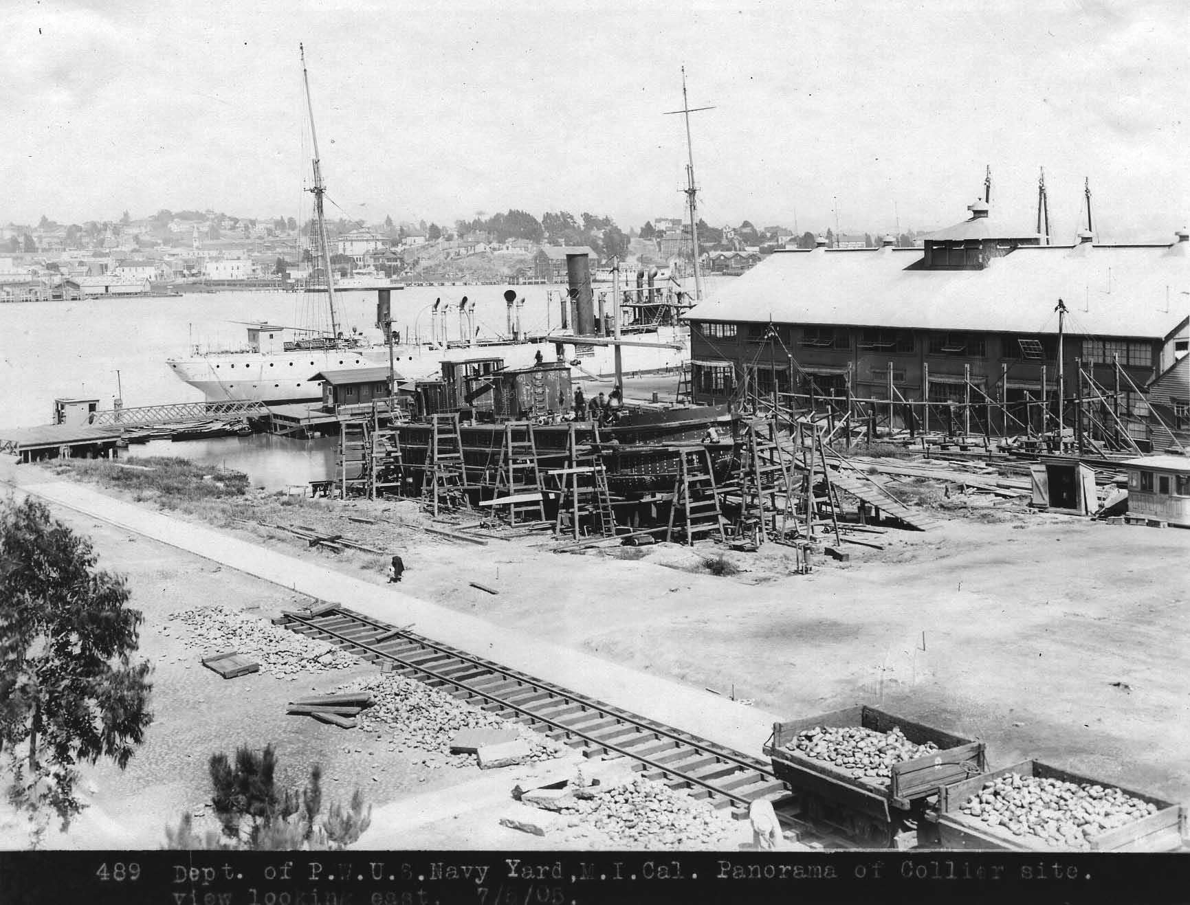 246k | Water Barge No. 16 on the building ways at Mare Island Navy Yard, 5 July 1905. The decommissioned Auxiliary Cruiser Buffalo is aft of YW-16. While the masts of the Training Ship Intrepid, being outfitted at the yard, can be seen above the building to the right of the water barge.Photo caption reads "Dept. of P.W.U.S. Navy Yard, M.I. Cal. Panorama of Collier Site view looking east 7/5/05." Mare Island Navy Yard photo # MINSY 489-7-05. |