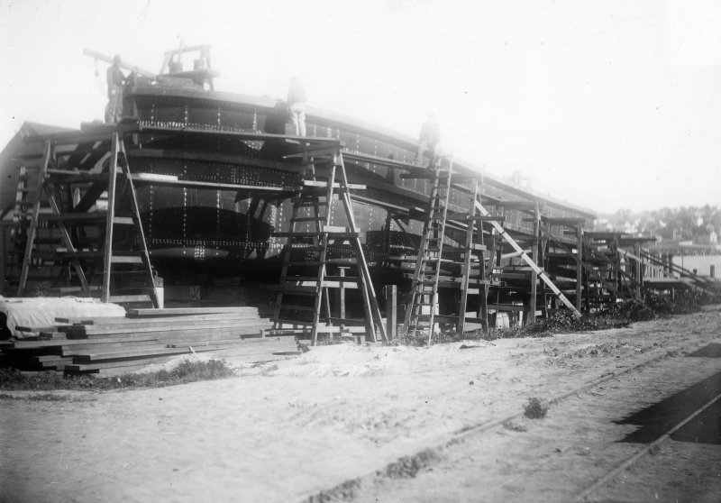 75k | Water Barge No. 16 on the building ways at Mare Island Navy Yard in the spring of 1906. Mare Island Navy Yard photo # YW 16 1-4-06. |