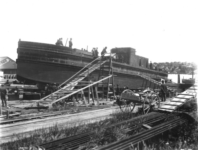67k | Water Barge No. 16 half way down the building ways at Mare Island, 26 June 1906. The decommissioned Auxiliary Cruiser Buffalo is to the right. Mare Island Navy Yard photo # YW 16 1-6-06 6/26/06.. |