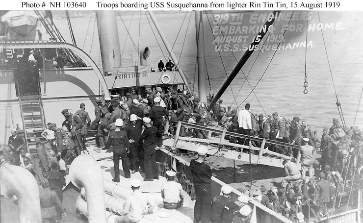 84k | USS Rin Tin Tin in a French port (probably Brest), transferring troops of the US Army's 319th Engineers to Susquehanna (ID-3016), for their passage home, 15 August 1919.