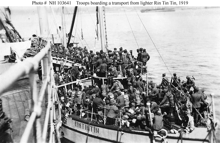 84k | USS Rin Tin Tin in a French harbor, probably Brest) bringing American troops out to board a transport for their passage home, circa mid-1919. US Navy photo # NH 103639 from the collections of the US Naval Historical Center, donation of Dr. Mark Kulikowski, 2006. |