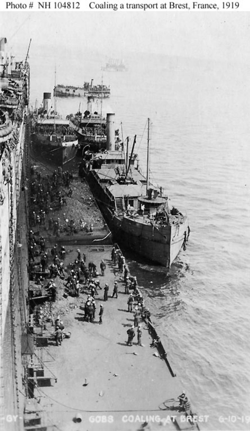 217k | US Navy sailors coaling a large transport (possibly USS Imperator (ID# 4080)) at Brest, France, 10 June 1919. In addition to the coal barges, three ferry tenders are alongside and another is in the middle distance. The closest to the camera, alongside one of the coal barges, is USS Rin Tin Tin. The other three lighters are crowded with troops, probably awaiting transfer to the transports for the passage home. The two tenders directly aft of Rin Tin Tin are the White Star Line's Nomadic (inboard) and Traffic (outboard). The tender in the middle distance is Amackassin.The ship faintly visible in the center distance is either USS Saint Louis (Cruiser # 20) or USS Charleston (Cruiser # 22). The original photograph was printed on post card ("AZO") stock. US Navy photo # NH 104812 from the collections of the US Naval Historical Center, donation of Dr. Mark Kulikowski, 2007. |
