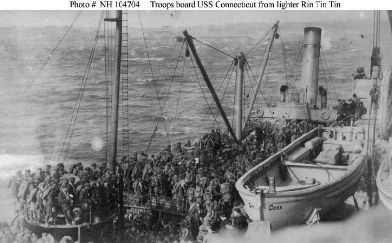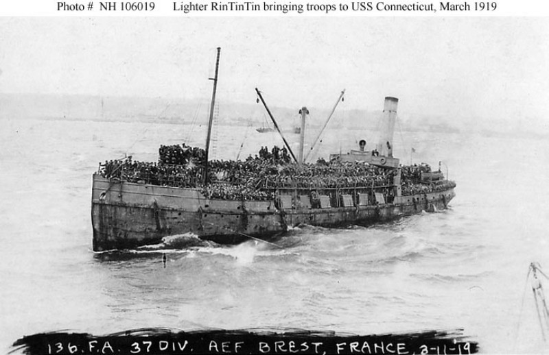 90k | USS Rin Tin Tin approaching USS Connecticut (Battleship # 18) in the harbor at Brest, France, 11 March 1919. Rin Tin Tin is bringing out troops of the 136th Field Artillery, 37th Division, for transportation home to the United States. The original photograph is printed on post card ("AZO") stock. US Navy Photo # NH 106019 from the collections of the US Naval Historical Center. |