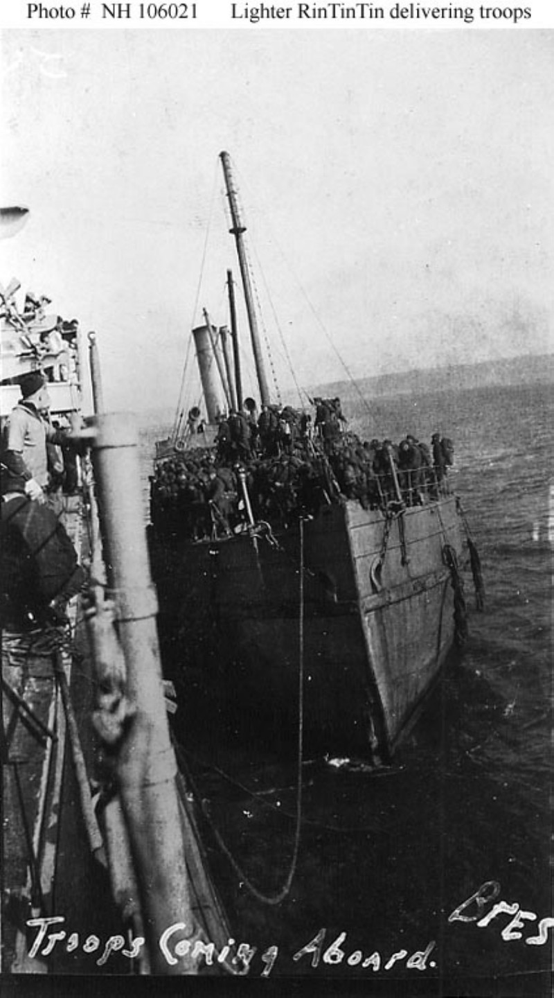 85k | USS Rin Tin Tin (at right) alongside another lighter (which has a long lattice-type crane boom) in Brest Harbour, France, 1919. Both are loaded with troops being carried out to a transport for passage home to the United States. The original photograph is printed on post card ("AZO") stock, and was mailed to Camp Merritt, New Jersey, on 6 May 1919, by a soldier who was preparing for discharge from the Army.