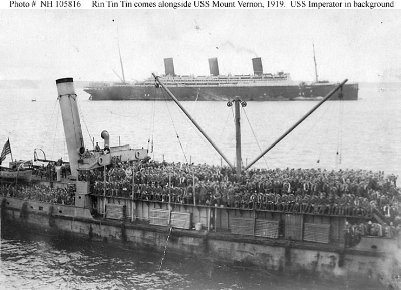 115k | USS Rin Tin Tin coming alongside USS Mount Vernon (ID-4508) to transfer troops for passage home to the United States, in Brest Harbour, France, circa May 1919. USS Imperator (ID-4080) is in the background. US Navy photo # NH 105816 from the collections of the US Naval History and Heritage Command, donation of Charles R. Haberlein, 2008. |