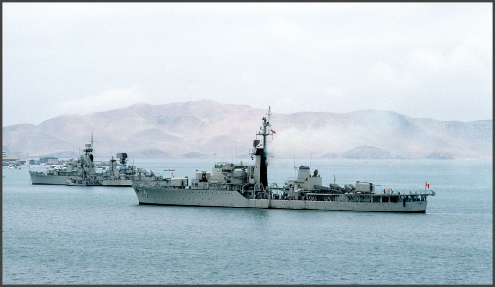BAP Castilla (D71) ex-HrMS Utrecht (D817), left, at anchor at Callao, Peru.