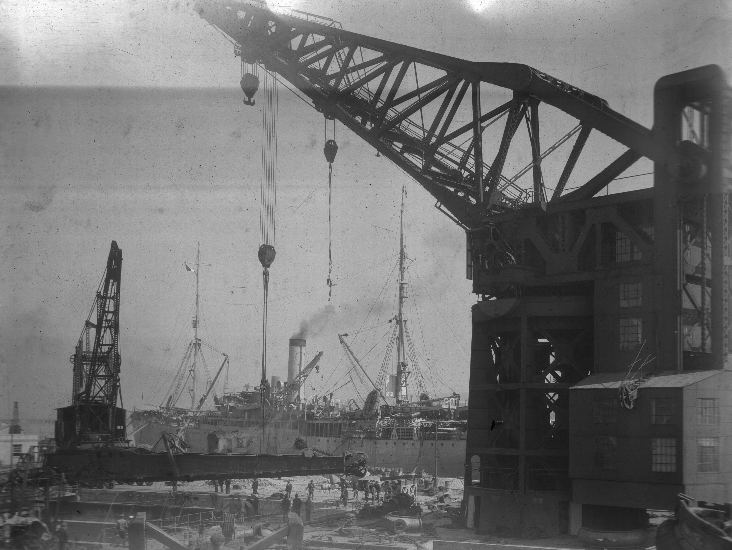 YD-33 and Dry Dock Crane #1 handling the suction cutter head of the US Army Dredge Sacramento at Mare Island, 4 September1919. Note USS Bath (ID-1997) in the background | Darryl Baker | ||