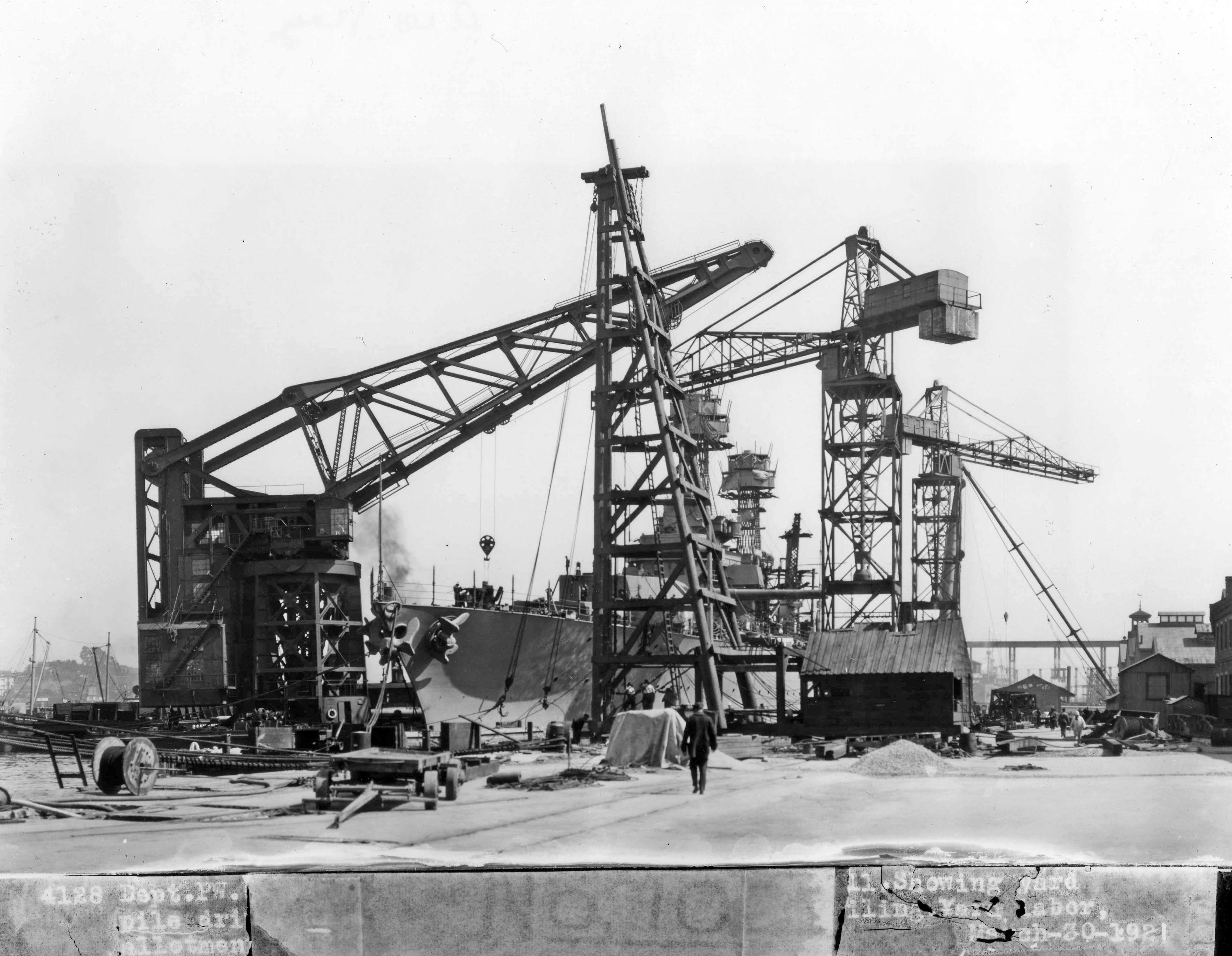 YD-33 alongside USS California (BB-44) at her outfitting berth, 30 March 1921. Note: One of California's forward 14" guns has been installed. MINYPW Photo # 4128-3-1921, Navy Photo, 3/30/1921 |