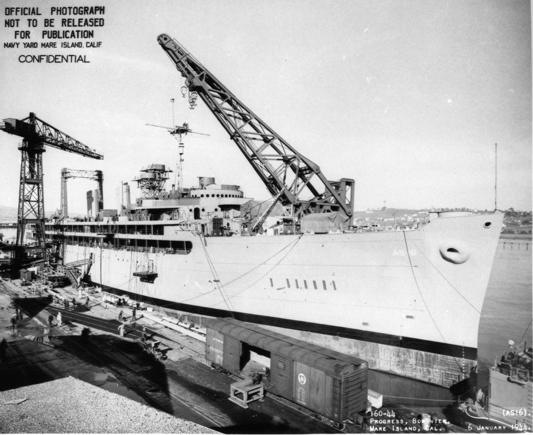 YD-33 alongside USS Howard W. Gilmore (AS-16) at Mare Island Navy Yard, 6 January 1944. File name: AS 16 160-44, Navy Photo, 1/6/44 | Darryl Baker | ||